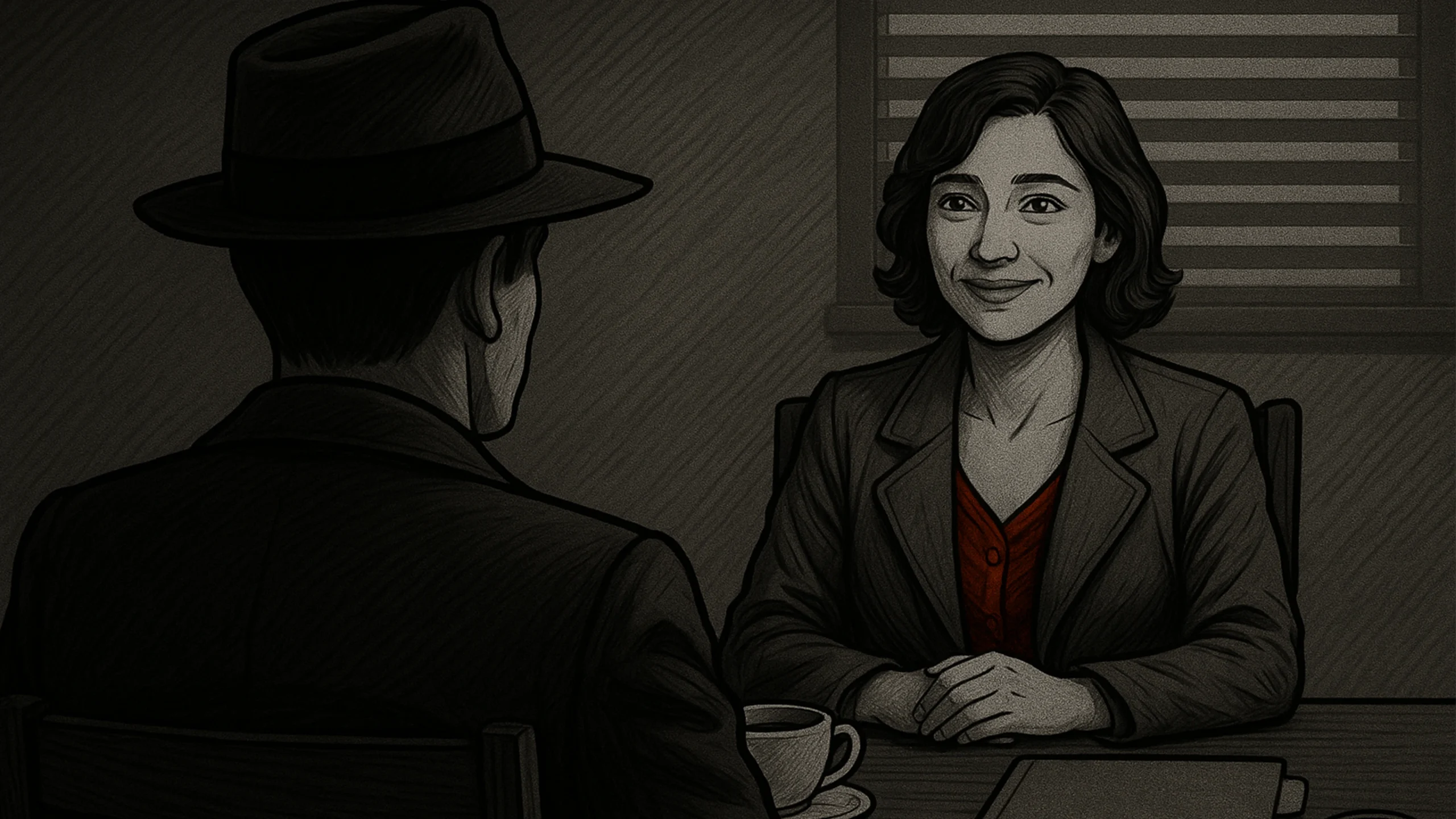Illustration from a detective-style code of conduct training module showing a female character being interviewed by a noir detective, part of a compliance eLearning course.